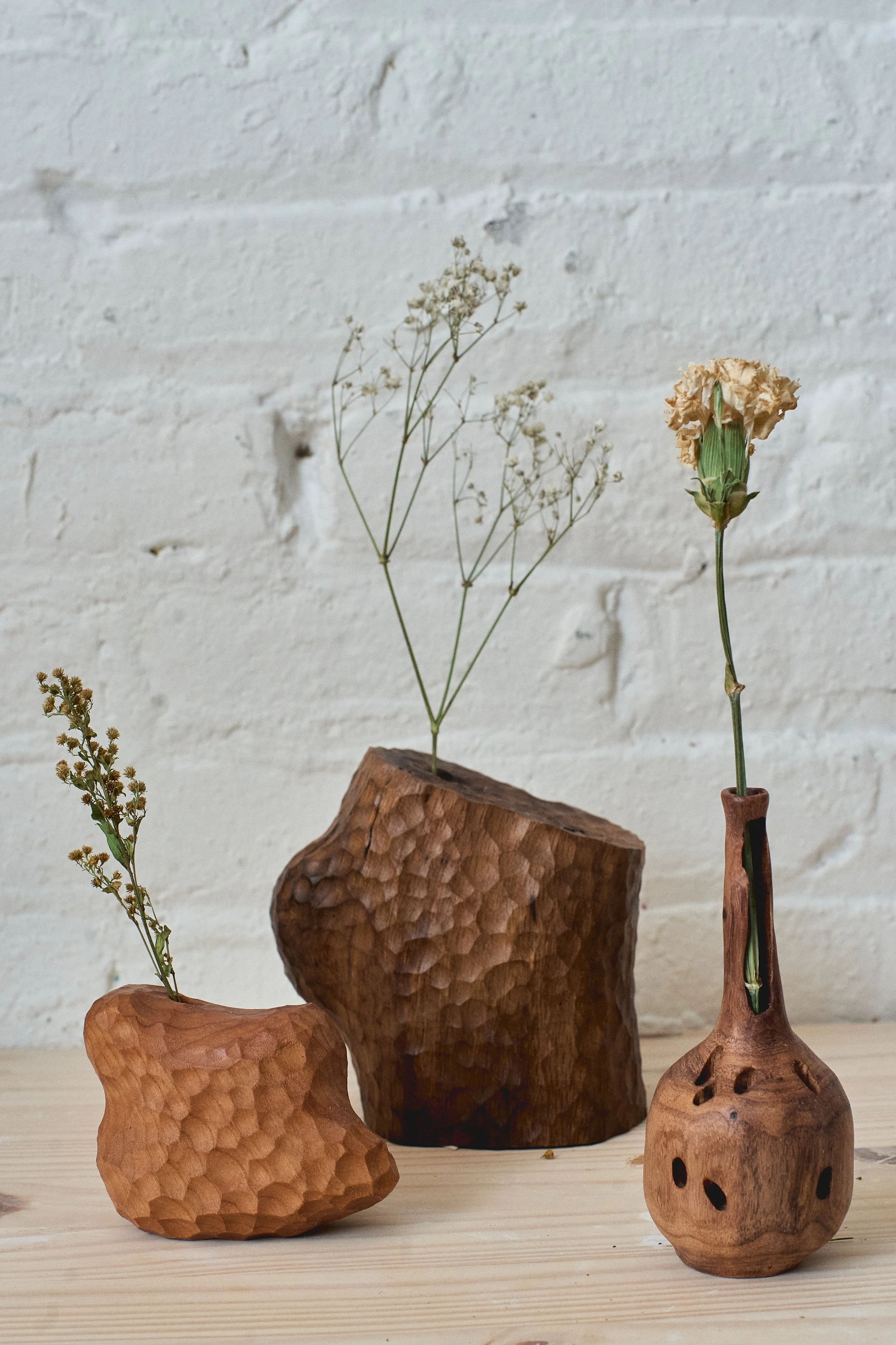 Carved from Mesquite wood that I salvaged from my family’s ranch in Sonora, Texas, this vase preserves a piece of wood that was headed for the burn pile. Its surface is marked by small holes and tunnels left by the emerald ash borer—an invasive beetle—so the material carries a visible record of what threatened it. Finished and shaped into a clean vessel form, the piece holds a tension between polish and scar: a functional object that keeps the story of place, damage, and rescue intact.